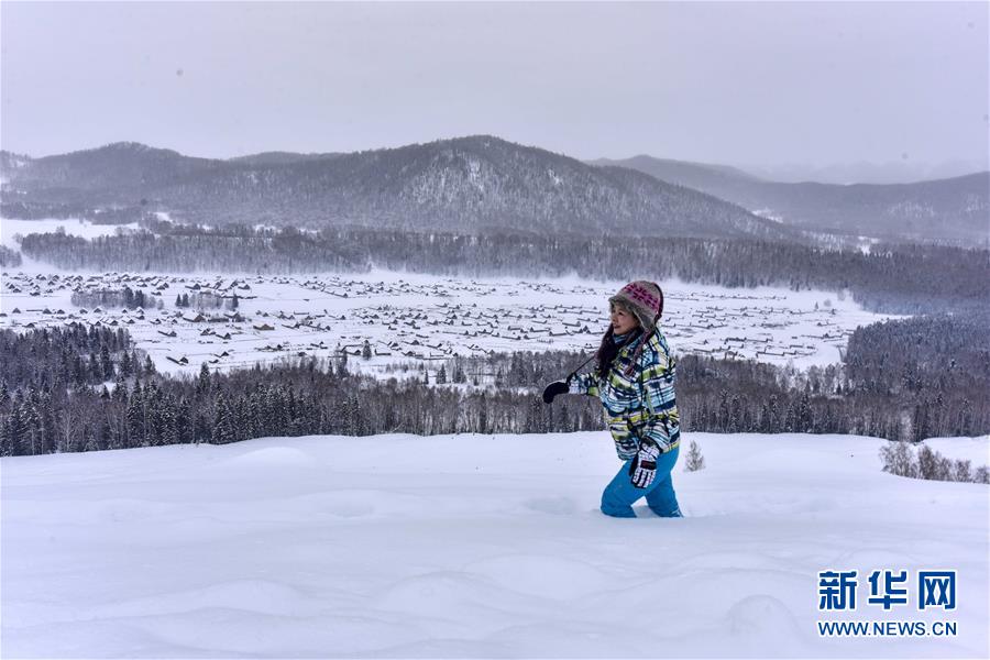 1月1日,在新疆禾木雪鄉(xiāng),一名游客體驗(yàn)“跳雪”。