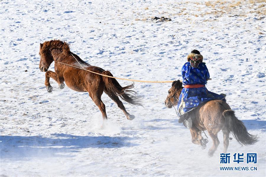 1月8日,牧民在馴服一匹烈馬。 時(shí)下正值草原冬季旅游旺季,內(nèi)蒙古自治區(qū)西烏珠穆沁旗的牧民們?cè)谘┰弦徽股硎郑瑸橛慰驼宫F(xiàn)獨(dú)特的民族風(fēng)情。 新華社記者 鄒予 攝