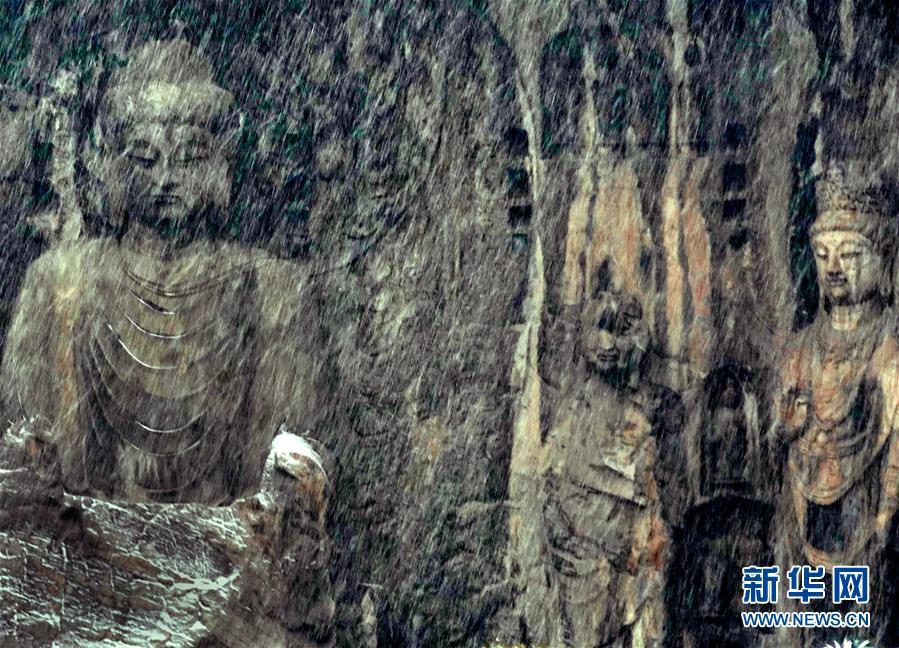 洛陽龍門石窟景區(qū)內的盧舍那大佛在雪中若隱若現(1月9日攝)。 新華社記者李安攝