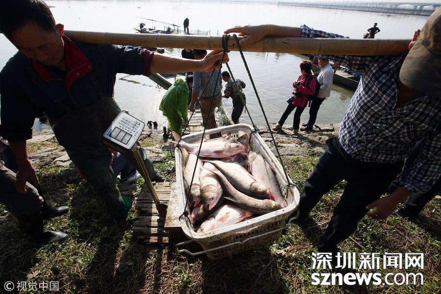 江蘇揚州,漁夫?qū)Ⅳ~撈出過秤。