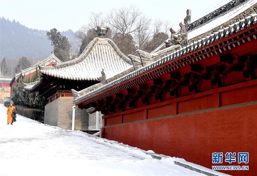 1月10日,少林寺一名僧人在雪中行走。當(dāng)日,雪后初霽,河南登封少林寺分外秀美。 新華社記者 朱祥 攝