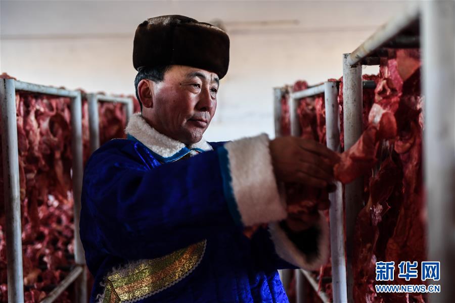 1月9日,牧民伊拉代在查看風干牛肉的成色。 新華社記者 劉磊 攝