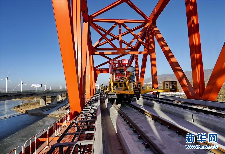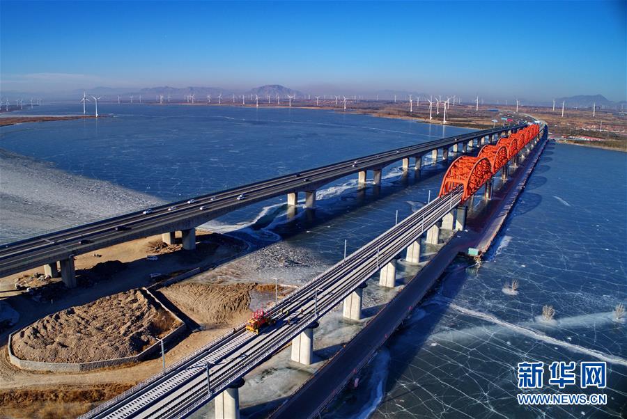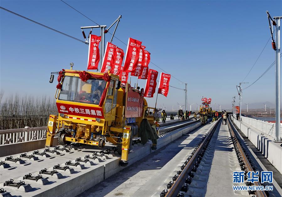 當日,京張高鐵官廳水庫特大橋鋪軌工作完成。京張高鐵全長174公里,是2022年北京冬奧會的重要交通保障線。