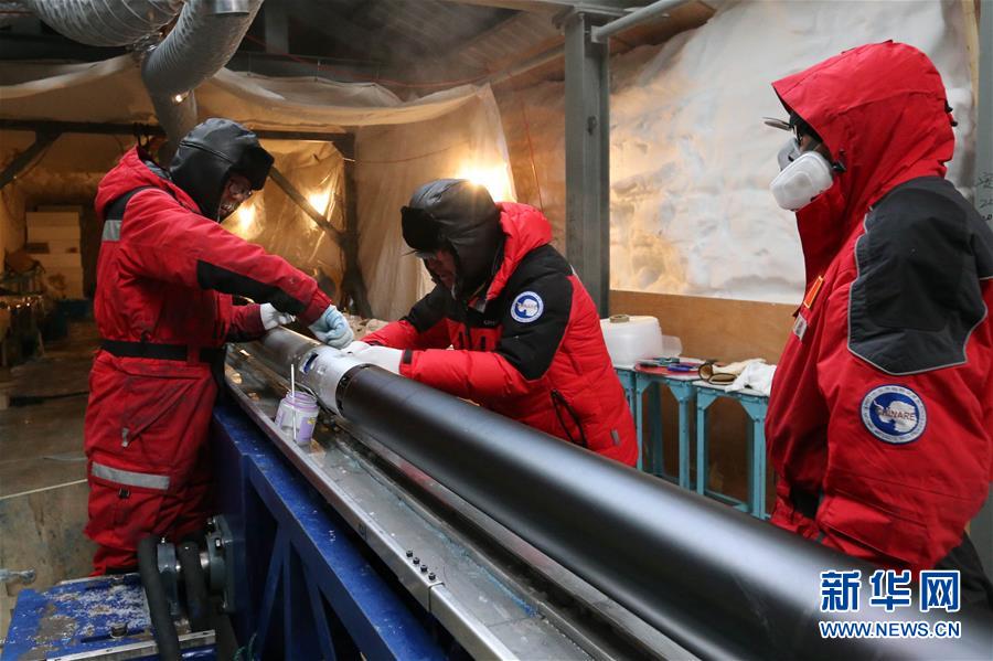 科考隊員處理鉆取的2.8米長冰芯(1月12日攝)。 新華社記者 劉詩平 攝