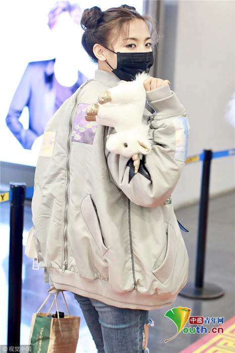 2019年1月14日,北京,楊超越現(xiàn)身機(jī)場(chǎng)。她扎哪吒頭活力十足,甩玩偶淘氣回眸,穿破洞褲露美腿,披面包服似自帶鼓風(fēng)機(jī)。