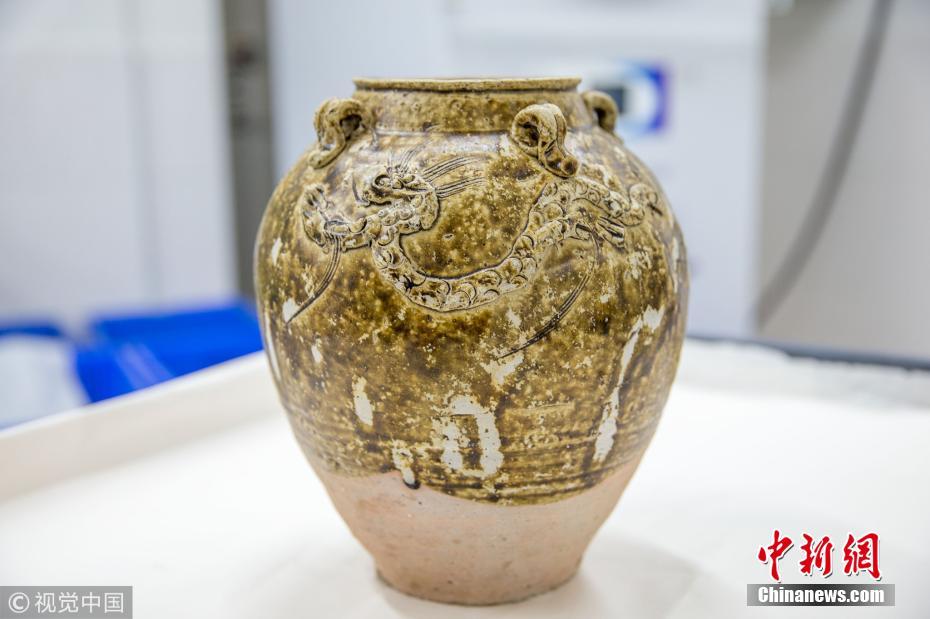 近日,廣東省博物館文物保護(hù)科技中心出水文物保護(hù)實(shí)驗(yàn)室里,一個修復(fù)后的出水明代四系醬釉龍紋罐。譚慶駒 攝 圖片來源:視覺中國