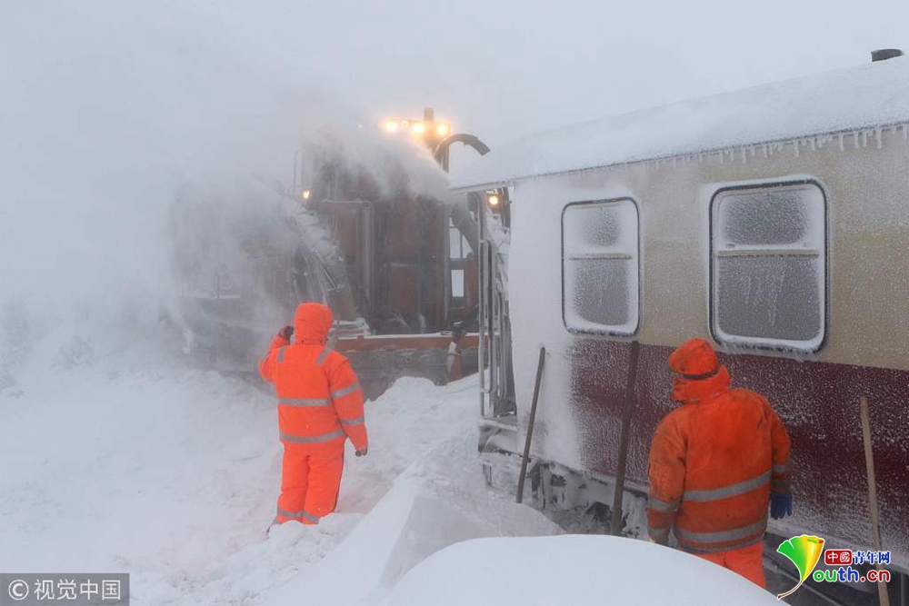 當?shù)貢r間2019年1月9日,德國錫爾克,一輛蒸汽火車被大雪困住無法前進。
