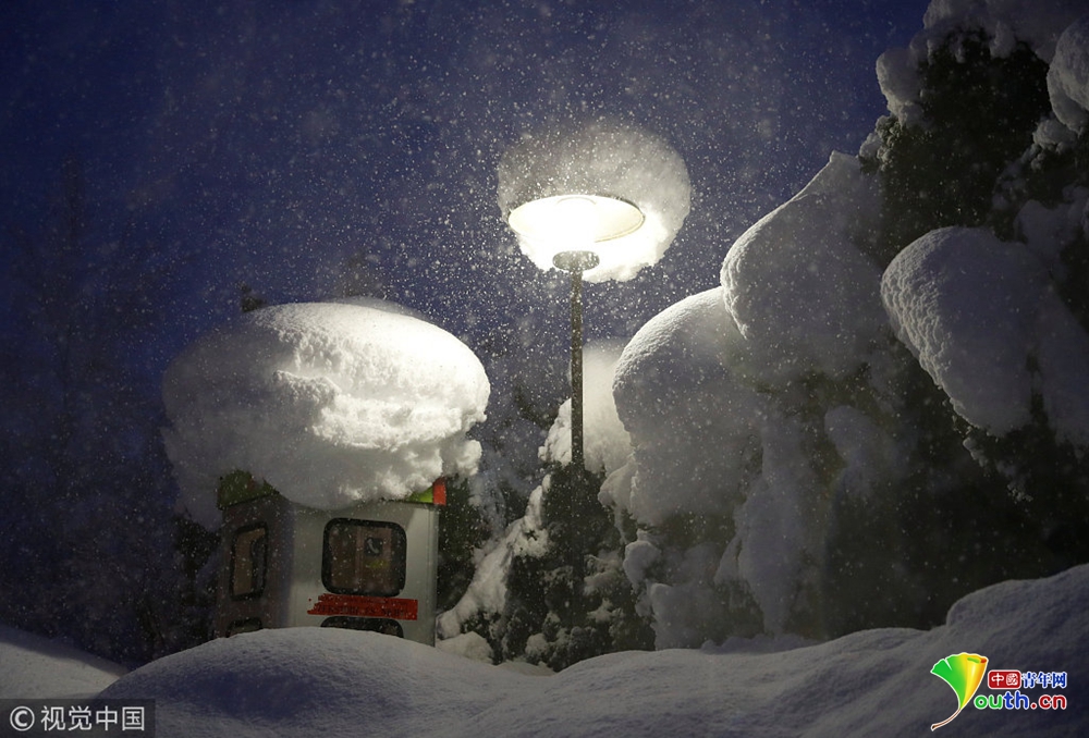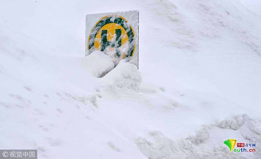 當?shù)貢r間2019年1月14日,奧地利Reitdorf,當?shù)卦庥霰╋L雪襲擊,公交車站被積雪掩埋。