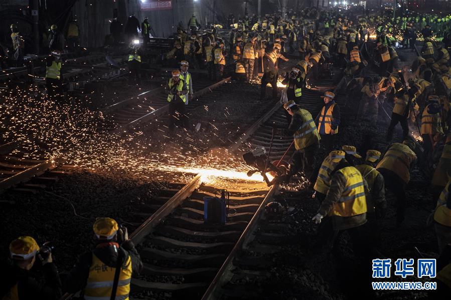 1月15日凌晨,中鐵十一局施工人員在西安站改現場緊張施工。新華社記者陶明攝