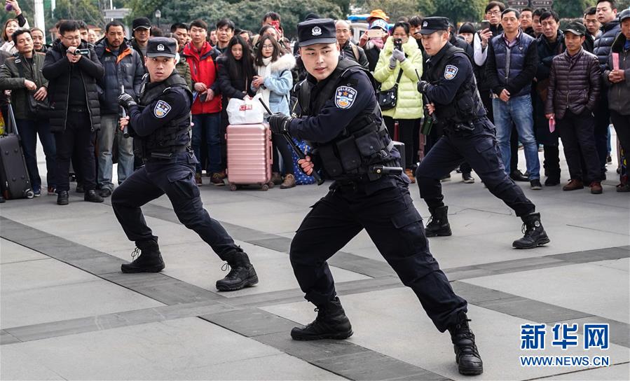 1月16日,旅客在觀看民警技能演練。 當(dāng)日,武漢鐵路公安處在漢口火車站舉行警營(yíng)開(kāi)放日活動(dòng),讓旅客零距離接觸警務(wù)安全工作,營(yíng)造良好的春運(yùn)出行環(huán)境。 新華社記者程敏攝