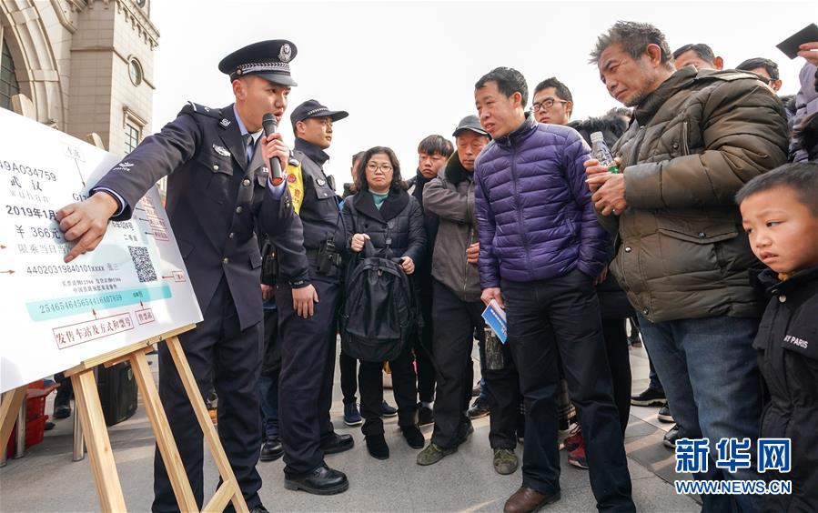 1月16日,民警講解真假火車票辨識(shí)方法。 當(dāng)日,武漢鐵路公安處在漢口火車站舉行警營(yíng)開(kāi)放日活動(dòng),讓旅客零距離接觸警務(wù)安全工作,營(yíng)造良好的春運(yùn)出行環(huán)境。 新華社記者程敏攝