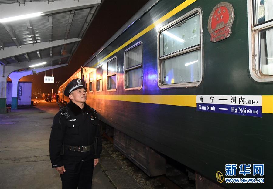 在廣西憑祥火車站,鐵路公安民警陸日峰在一列準(zhǔn)備開(kāi)往越南的火車旁值勤(2018年12月31日攝)。 新華社記者陸波岸攝