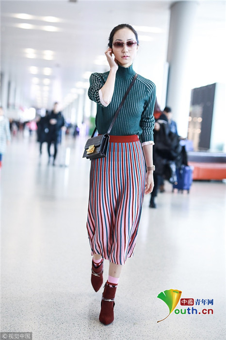 2019年1月17日,上海,韓雪現(xiàn)身機場,穿著條紋紗裙露出小腿,十分抗凍,她搭配經(jīng)典的駝色大衣,氣質(zhì)出眾在機場人群中相當搶鏡。