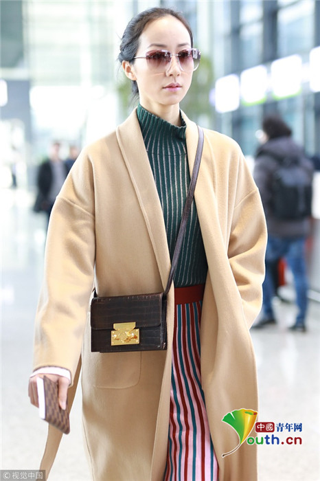 2019年1月17日,上海,韓雪現(xiàn)身機(jī)場(chǎng),穿著條紋紗裙露出小腿,十分抗凍,她搭配經(jīng)典的駝色大衣,氣質(zhì)出眾在機(jī)場(chǎng)人群中相當(dāng)搶鏡。