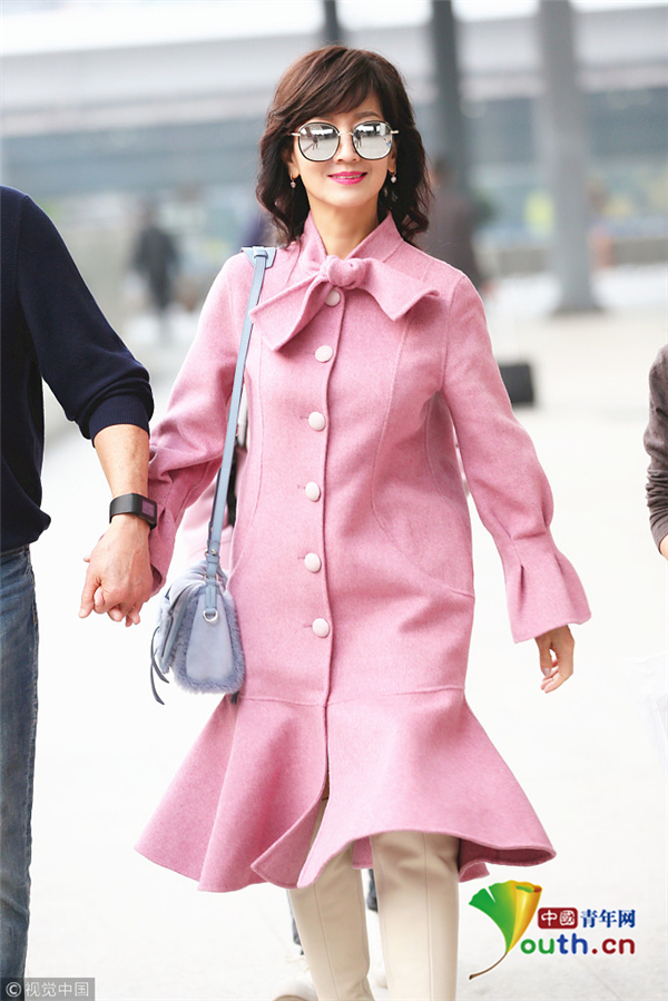 1月22日,廣東深圳,近日,趙雅芝與丈夫黃錦燊現(xiàn)身機(jī)場(chǎng),黑超遮面的她身著粉色昵子魚尾大衣,氣質(zhì)超群,一路獲粉絲跟隨,共先生黃錦燊牽手同行。