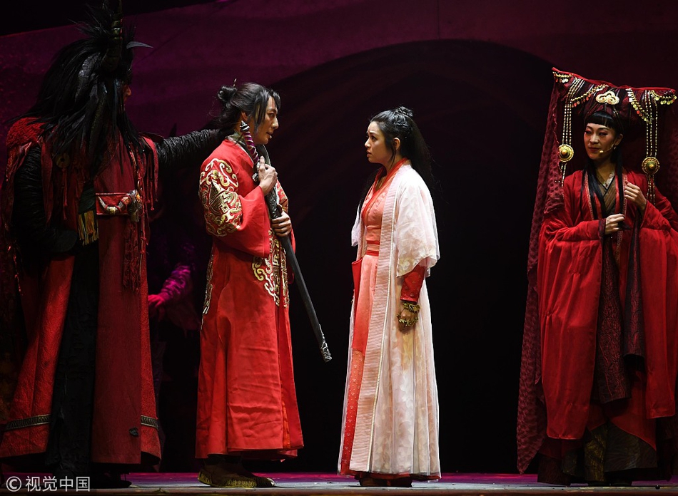 日前,舞臺(tái)劇《大話西游之大圣娶親》在梅蘭芳大劇院首次公開演出。陳妍希飾演“紫霞仙子”靈氣十足。視覺(jué)中國(guó)/圖