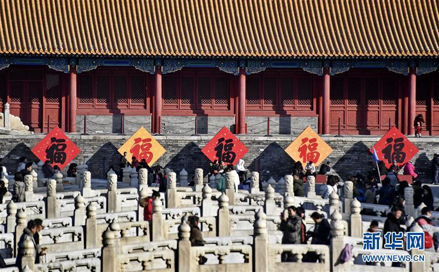 1月25日,游人在故宮內(nèi)的“五?!鼻傲粲?。 春節(jié)將至,北京故宮博物院內(nèi)張燈結(jié)彩,到處懸掛著宮燈、萬壽燈、年畫、門神、福字等古代宮廷節(jié)日裝飾品,讓來自國內(nèi)外的游人感受到濃濃的年味。 新華社記者 李欣攝