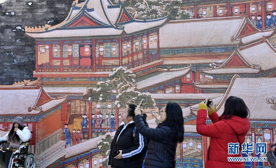 1月25日,游人在故宮內拍攝古代宮廷過春節(jié)的繪畫。 春節(jié)將至,北京故宮博物院內張燈結彩,到處懸掛著宮燈、萬壽燈、年畫、門神、福字等古代宮廷節(jié)日裝飾品,讓來自國內外的游人感受到濃濃的年味。 新華社記者 李欣攝