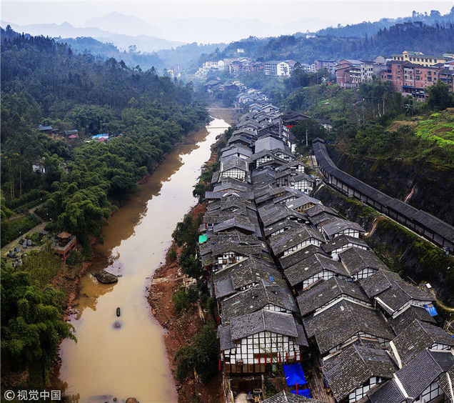 2019年1月26日,重慶中山古鎮(zhèn),880桌“千米長(zhǎng)宴”5萬(wàn)人共品年味。夜幕下的中山古鎮(zhèn),燈光璀璨,流水潺潺。