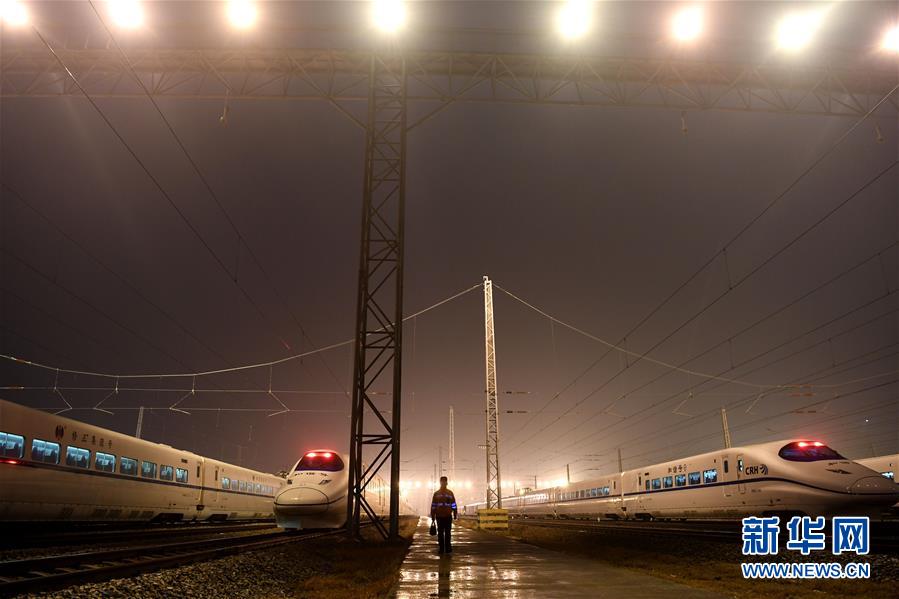 1月29日,王瑞在合肥南動(dòng)車運(yùn)用所存車場(chǎng)走向下一輛動(dòng)車。新華社記者劉軍喜攝
