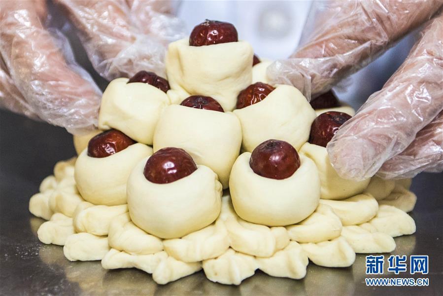 1月25日,河北棗強(qiáng)一家食品公司的面點(diǎn)師在手工制作花糕。 春節(jié)臨近,河北省棗強(qiáng)縣面食加工廠的面點(diǎn)師傅們忙著趕制花糕、花饃等傳統(tǒng)面食,以供應(yīng)節(jié)日市場。當(dāng)?shù)赜羞^年蒸花糕、做花饃的習(xí)俗,寓意步步登高,生活一年比一年好。 新華社記者 李曉果攝