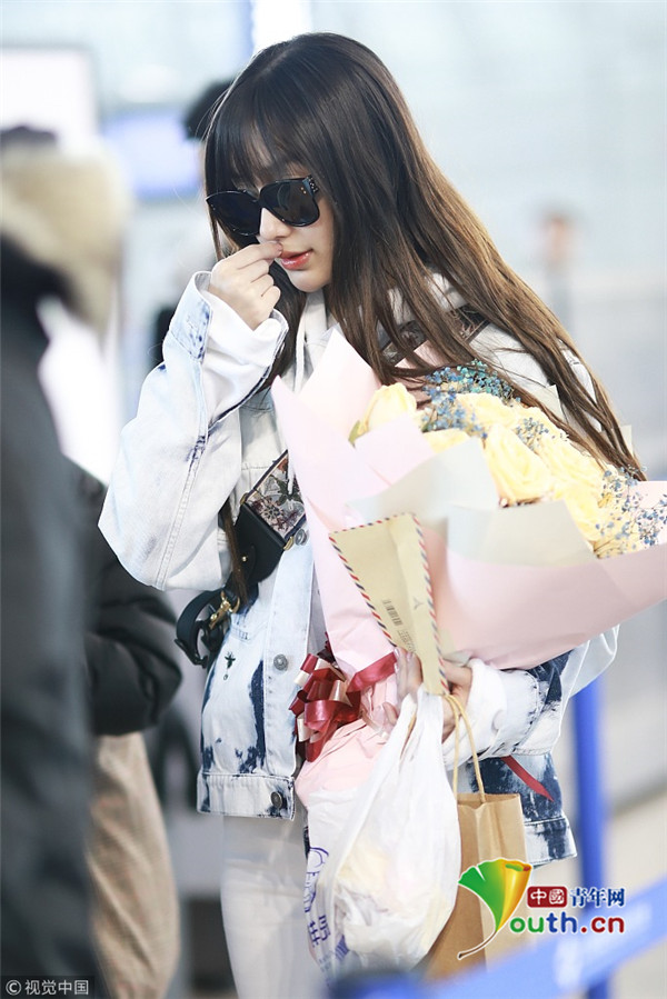 2019年2月24日,上海,楊穎現(xiàn)身機場。她全白套裝現(xiàn)身身材十分纖細,手捧粉絲送的花與小粉絲合影,十分親切。