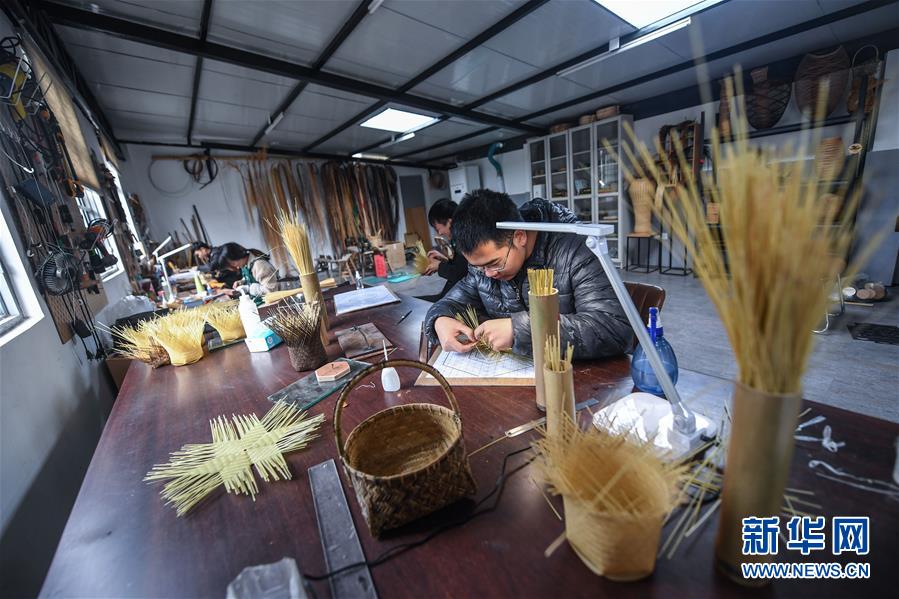 在烏鎮(zhèn)陳莊村竹蕓工房?jī)?nèi),工作人員在制作竹編產(chǎn)品(11月20日攝)。 新華社記者 徐昱 攝