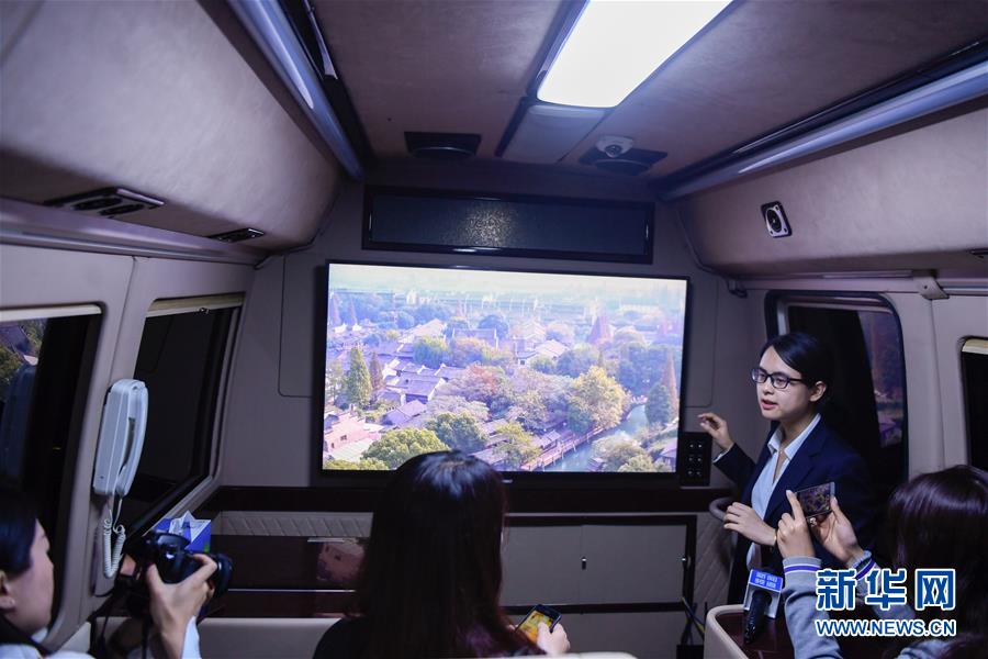 在浙江移動(dòng)烏鎮(zhèn)分水墩營(yíng)業(yè)廳外,工作人員在一輛體驗(yàn)巴士?jī)?nèi)介紹通過(guò)5G移動(dòng)傳輸技術(shù)實(shí)現(xiàn)的8K高清的視頻畫面實(shí)時(shí)展示(10月30日攝)。 新華社記者黃宗治攝
