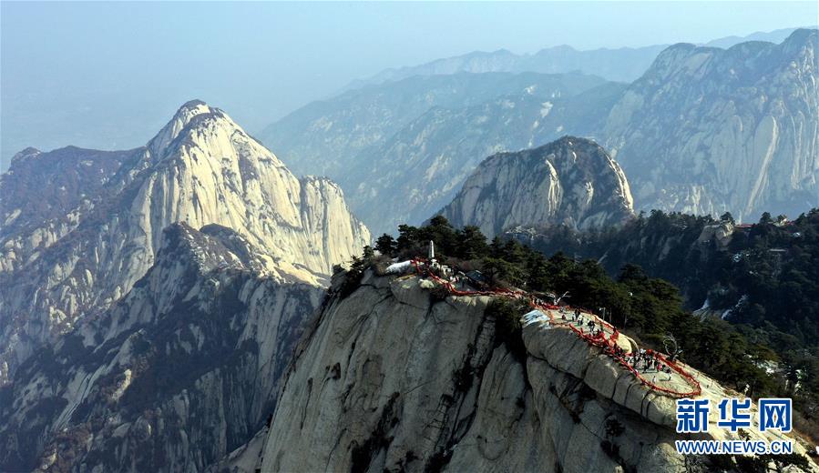 3月9日,游人在華山西峰游覽(無人機(jī)拍攝)。 隨著氣溫回升,陜西著名風(fēng)景區(qū)華山進(jìn)入旅游旺季。 新華社記者 陶明 攝