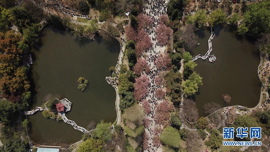 3月31日,游客在中國(guó)科學(xué)技術(shù)大學(xué)東區(qū)觀賞櫻花(無(wú)人機(jī)拍攝)。