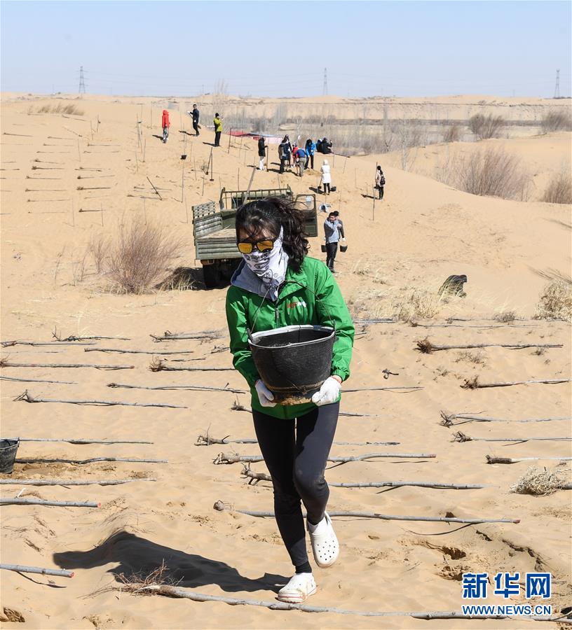 3月31日,一名青年志愿者正在取水澆灌。 當(dāng)日,200余名中韓兩國青年志愿者來到內(nèi)蒙古自治區(qū)達(dá)拉特旗庫布其沙漠種樹。2006年起,中國國際青年交流中心與韓國韓中文化青少年協(xié)會組織兩國青年志愿者在庫布其沙漠植樹,參與防沙固沙項(xiàng)目。截至目前已植樹850多萬株,造林3萬多畝。 新華社記者 劉磊 攝