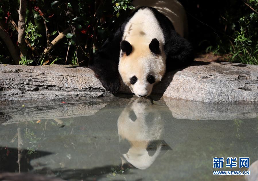4月6日,在美國(guó)圣迭戈動(dòng)物園熊貓館,大熊貓“白云”在喝水。新華社記者李穎攝