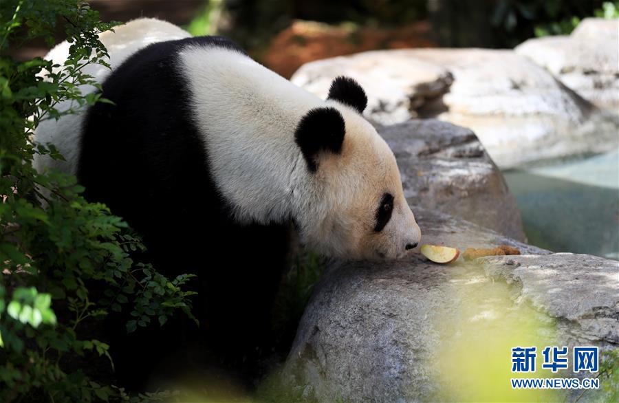 4月6日,在美國(guó)圣迭戈動(dòng)物園熊貓館,大熊貓“白云”在吃水果。新華社記者李穎攝