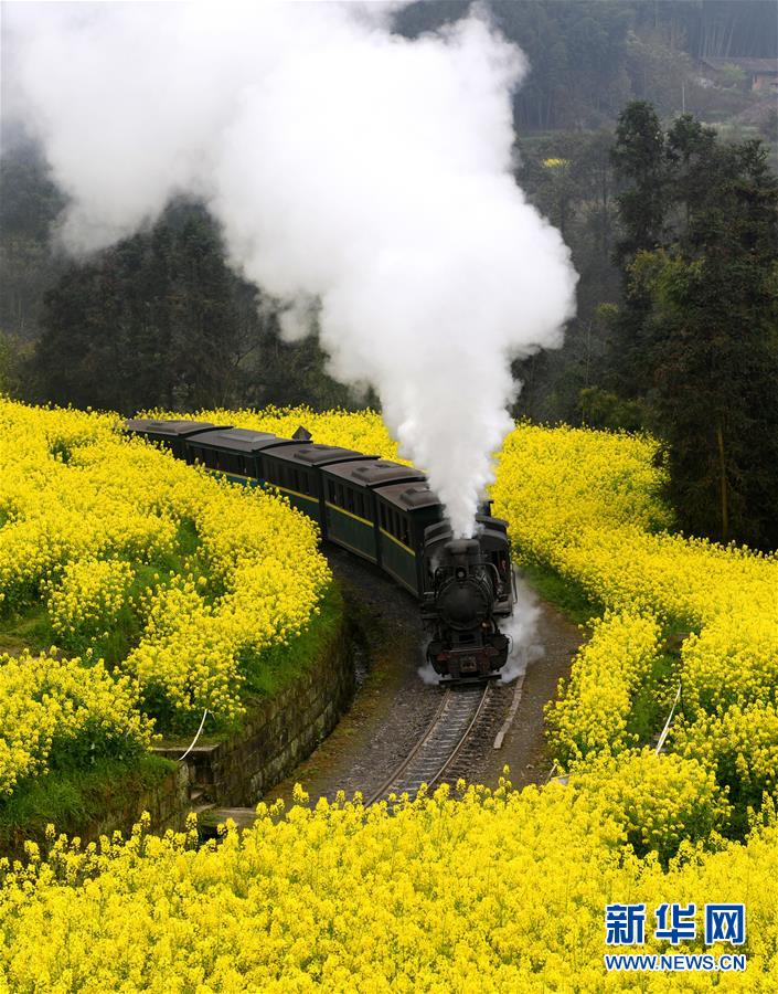 3月20日,一列嘉陽小火車在油菜花叢中穿行。