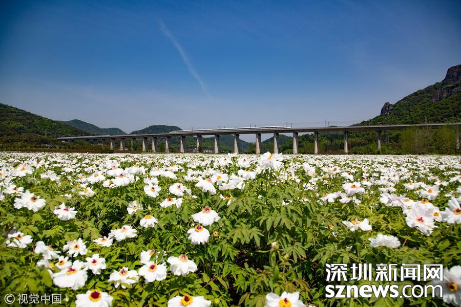 2019年4月8日,一列高鐵列車從京福高鐵安徽銅陵段一片盛開的鳳丹花海中駛過。隨著氣溫回升,安徽省銅陵市境內(nèi)的鳳丹競相綻放,高鐵列車穿行其間,成為春日里一道美麗的風景線。