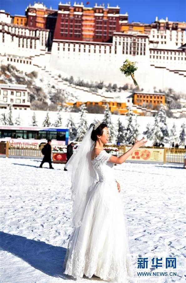 12月19日,一名女士在布達(dá)拉宮廣場(chǎng)上拍婚紗照。 12月18日,西藏拉薩市迎來(lái)今年入冬以來(lái)的首場(chǎng)降雪。19日清晨,拉薩雪后初霽,處處銀裝素裹,盡顯雪域高原之美。 新華社記者覺(jué)果攝