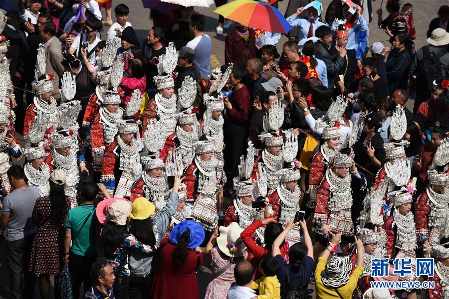 4月18日,臺江縣苗族群眾參加盛裝游演活動。 當(dāng)日,貴州省黔東南苗族侗族自治州臺江縣迎來一年一度的苗族姊妹節(jié)。節(jié)日期間將舉行苗族盛裝游演、千人長桌宴、千人游方體驗(yàn)、苗族手工創(chuàng)意大賽等一系列活動。 姊妹節(jié)是臺江縣苗族同胞的傳統(tǒng)節(jié)日,2006年被列入第一批國家級非物質(zhì)文化遺產(chǎn)名錄。 新華社記者 楊文斌 攝