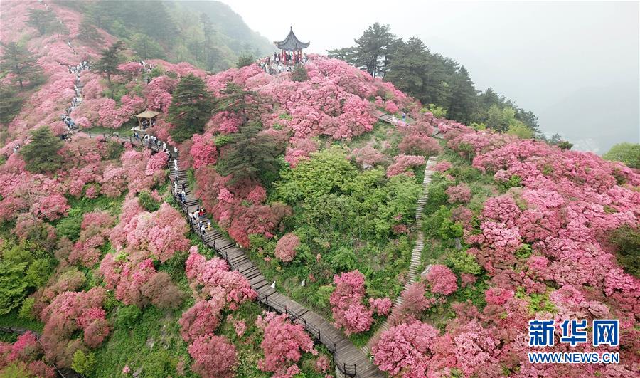 4月25日,游客在龜峰山杜鵑花海中游玩(無(wú)人機(jī)拍攝)。 近日,湖北省麻城市龜峰山的10萬(wàn)畝古杜鵑盛開(kāi),大量游客前來(lái)賞花觀景。 新華社記者 程敏 攝