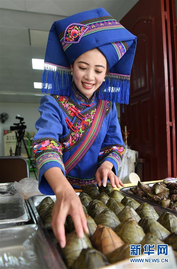 廣西靖西市鵝泉景區(qū)工作人員在擺放粽子等待游客(4月16日攝)。新華社記者 陸波岸 攝