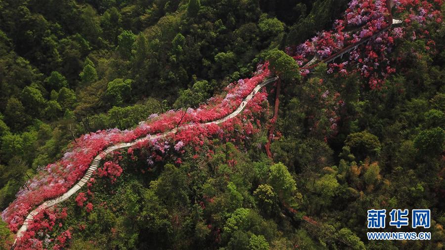 安徽省岳西縣天峽風景區(qū)內(nèi)的杜鵑花競相綻放(4月12日無人機拍攝)。 新華社記者 張端 攝