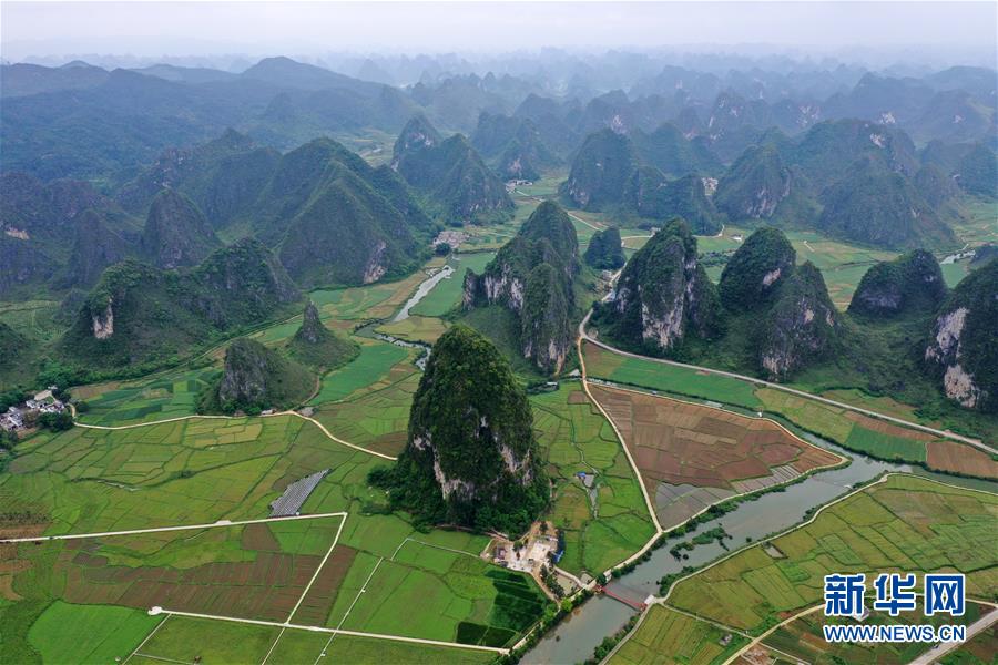 這是廣西靖西市新靖鎮(zhèn)境內(nèi)的田園風光(4月16日無人機拍攝)。 新華社記者 陸波岸 攝