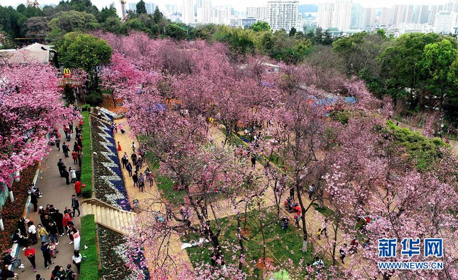 游人在云南昆明圓通山公園觀賞盛開的櫻花(3月16日無人機拍攝)。 新華社記者 秦晴 攝