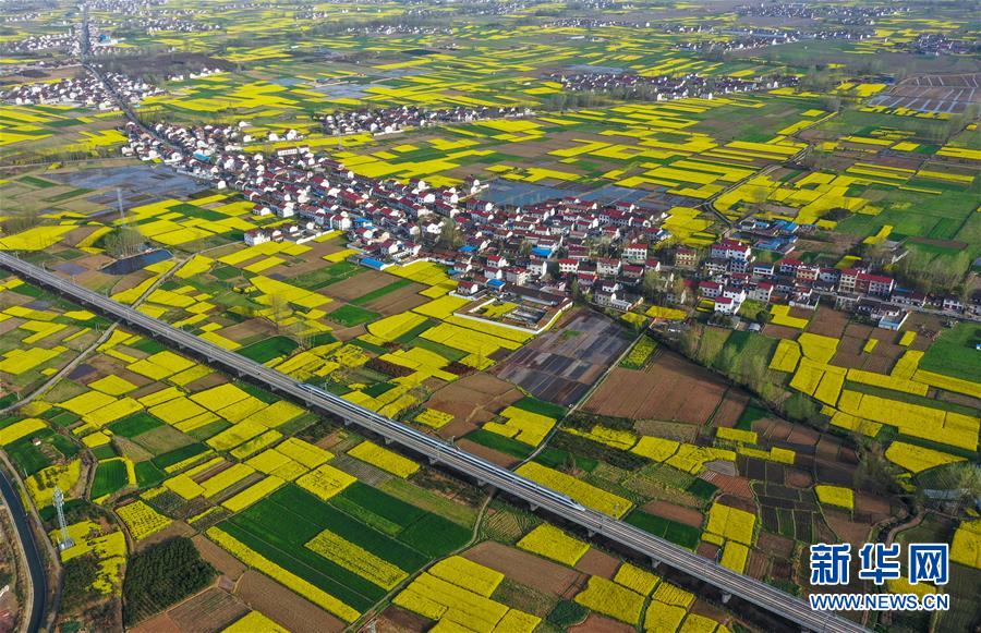 在陜西省漢中市城固縣境內(nèi),高鐵穿行在盛開的油菜花田間(3月28日無人機拍攝)。 新華社發(fā)(羅漢濤 攝)