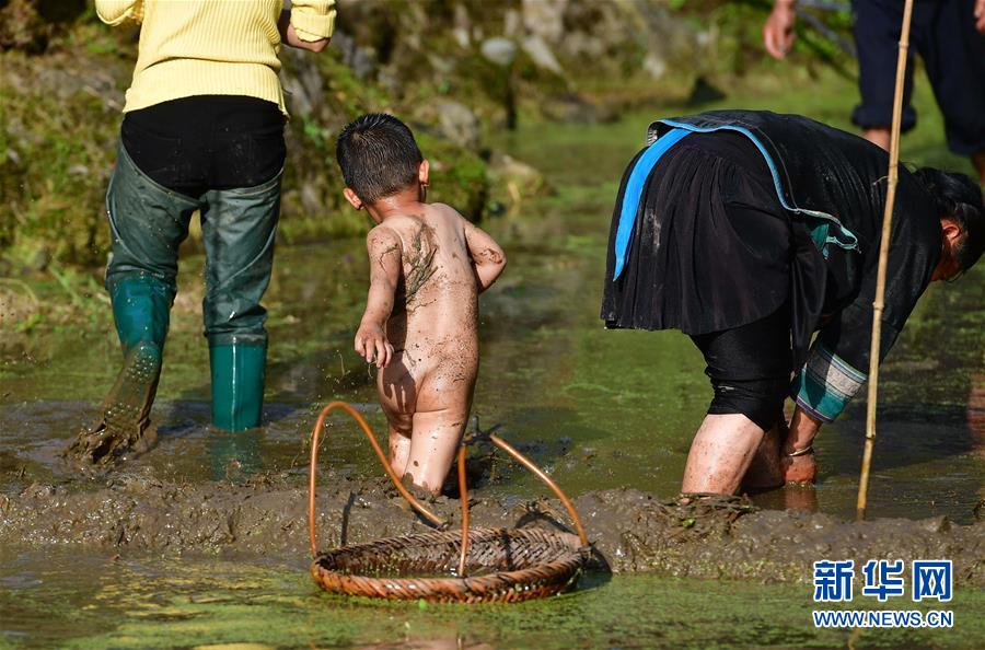 在黔桂烏英苗寨,小朋友在稻田里玩耍(4月16日攝)。 新華社記者 黃孝邦 攝