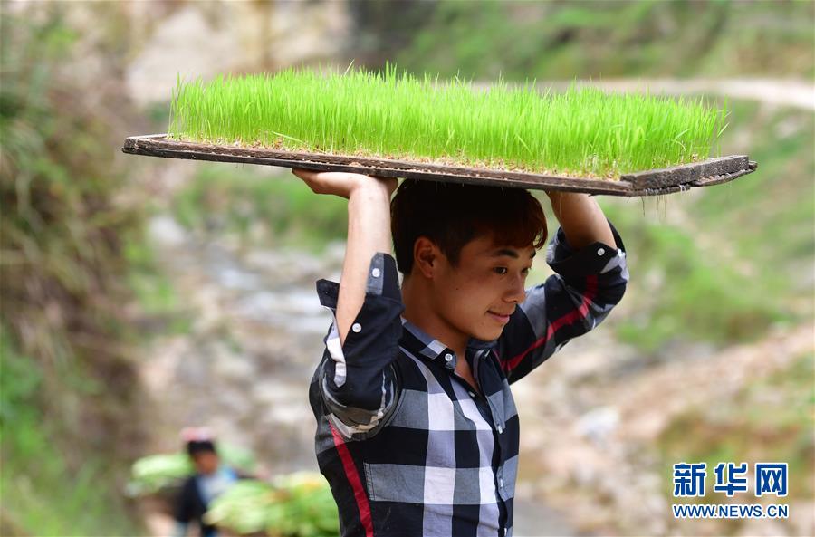 在黔桂烏英苗寨,村民搬運(yùn)秧苗去插秧(4月17日攝)。 新華社記者 黃孝邦 攝