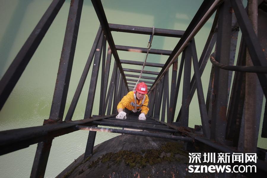 中國鐵路成都局有限公司重慶工務(wù)段53歲的橋隧工唐金華在白沙沱長江大橋的鋼架上檢查鋼梁的銹蝕情況(4月23日攝)。 4月23日下午5點40分,隨著重慶白沙沱長江大橋通行的最后一列客運列車順利通過,這座“服役”了59年的重慶首座長江大橋進入“退役”倒計時。4月24日后,所有列車將改線經(jīng)距白沙沱長江大橋約100米的新白沙沱長江特大橋通行,新橋“接力”老橋,運輸能力將得到大幅提升。 白沙沱長江大橋于1958年開工,1960年通過首趟列車,是繼武漢長江大橋之后的第二座長江大橋。 新華社記者 劉潺 攝