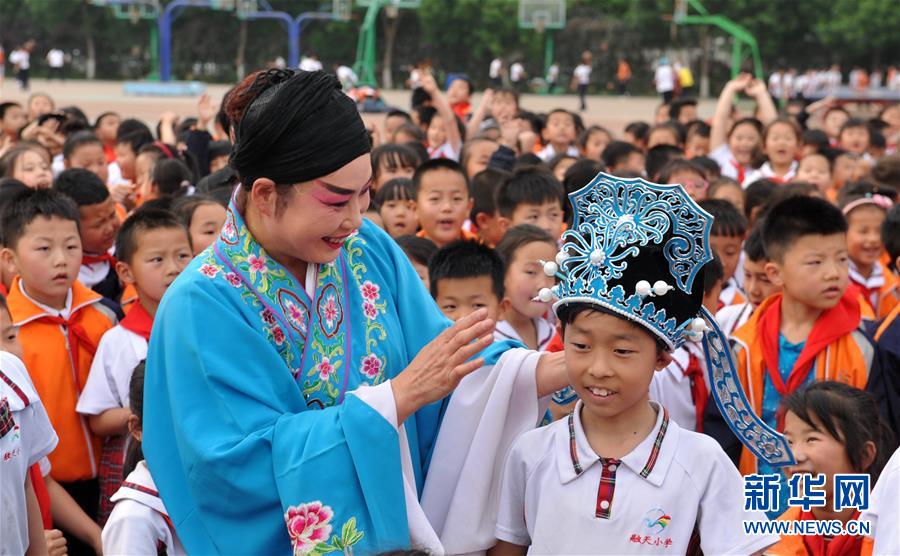 5月8日,滄州市小鳳霞評劇團演員在肅寧縣第三實驗小學與學生互動。