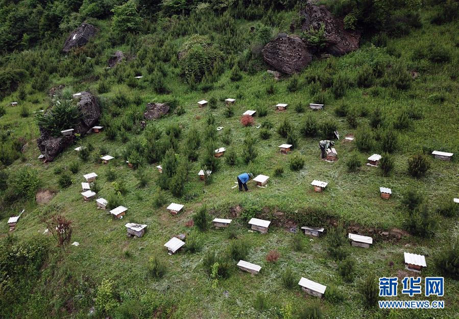 5月10日,在甘肅省隴南市徽縣大河店鎮(zhèn)硬灣村,蜂農(nóng)查看蜂箱情況(無人機拍攝)。 甘肅省隴南市徽縣大河店鎮(zhèn)硬灣村位于秦巴山區(qū)深處,2017年,在當(dāng)?shù)卣姆龀窒?,龍崖老巢蜜養(yǎng)殖農(nóng)民專業(yè)合作社成立,蜂農(nóng)們將傳統(tǒng)養(yǎng)蜂技藝和現(xiàn)代加工方式相結(jié)合,并通過電商等渠道打開銷路,有效帶動了當(dāng)?shù)刎毨Т迕衩撠氈赂弧D壳罢麄€合作社共有蜂箱2000余個,每箱每年可帶來三四千元的收入。 新華社記者 馬寧 攝