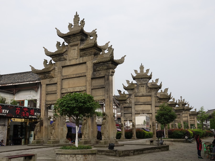 隆昌石牌坊大多為四柱三門三重檐五滴水石質(zhì)牌樓式建筑,平均面寬9米,通高11米,坊間距離最近處僅10余米。李仁奇 攝