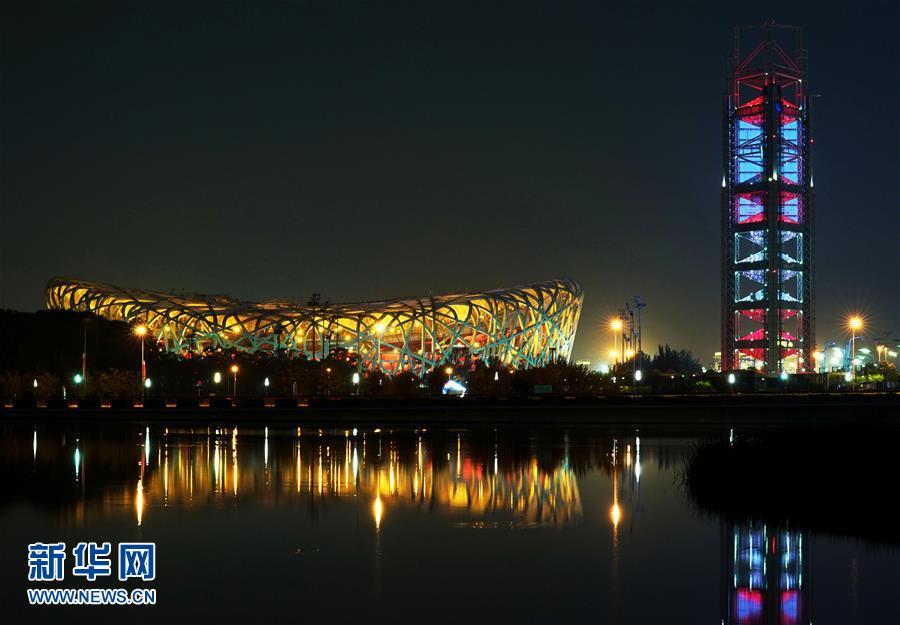 “鳥巢”和玲瓏塔交相輝映(5月14日攝)。 當晚,一場“空間光影秀”在北京上演。 新華社記者 陳建力 攝